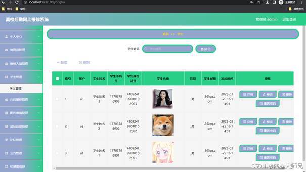 如图5.1显示的就是学生信息管理页面,此页面提供给管理员的功能有:学生信息的查询管理,可以删除学生信息、修改学生信息、新增学生信息,