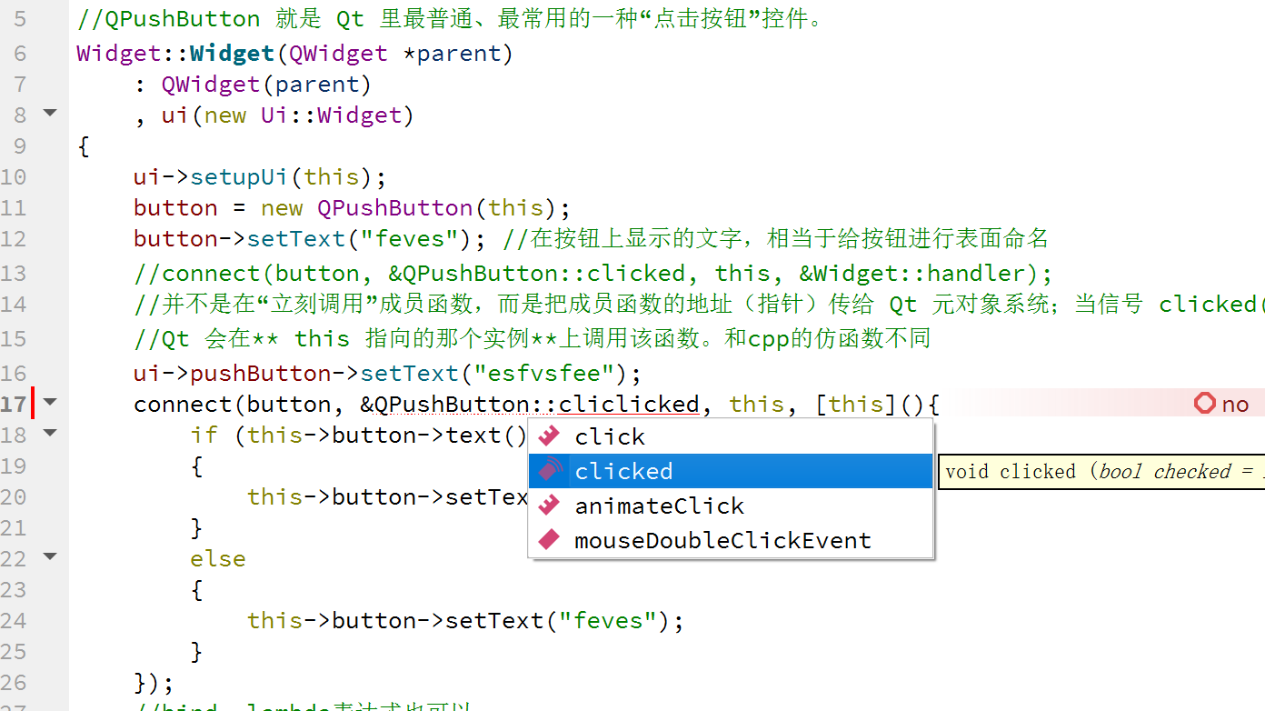 {ui->setupUi(this);button = new QPushButton(this);button->setText("feves"); //在按钮上显示的文字,相当于给按钮进行表面命名//connect(button, &QPushButton::clicked, this, &Widget::handler);//并不是在“立刻调用”成员函数,而是把成员函数的地址(指针)传给 Qt 元对象系统;当信号 clicked() 稍后发射时,//Qt 会在** this 指向的那个实例**上调用该函数。和cpp的仿函数不同ui->pushButton->setText("esfvsfee");connect(button, &QPushButton::clicked, this, [this](){if (this->button->text() == "feves"){this->button->setText("finish");}else{this->button->setText("feves");}});//bind, lambda表达式也可以}