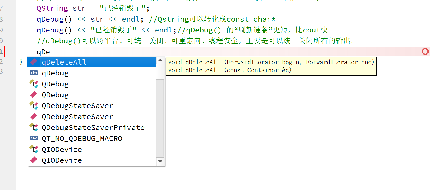 {//使用cout会导致输出和显示在控制台的编码格式不匹配,字符串是默认utf-8的格式进行编码的cout << "已经销毁了" << endl;//外面要正确显示只能使用qDebug, qDebug()相当于cout进行使用,规则完全一致QString str = "已经销毁了";qDebug() << str << endl; //Qstring可以转化成const char*qDebug() << "已经销毁了" << endl;//qDebug() 的“刷新链条”更短,比cout快//qDebug()可以跨平台、可统一关闭、可重定向、线程安全,主要是可以统一关闭所有的输出。