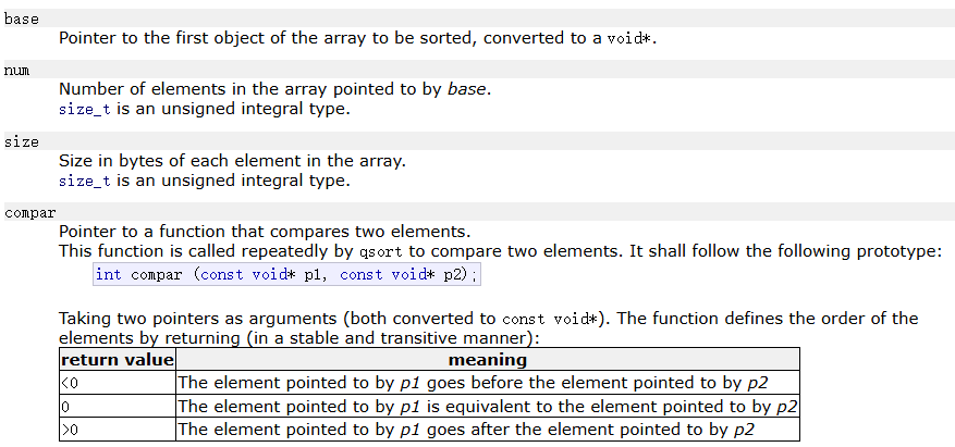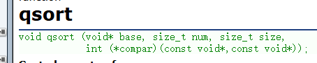 void qsort(void* base,//指针,指向的是待排序的数组的第一个元素size_t num, //是base指向的待排序数组的元素个数size_t size, //是base指向的待排序数组的元素的大小int (*compar)(const void*, const void*));//函数指针--指向的是两个元素的比较的函数