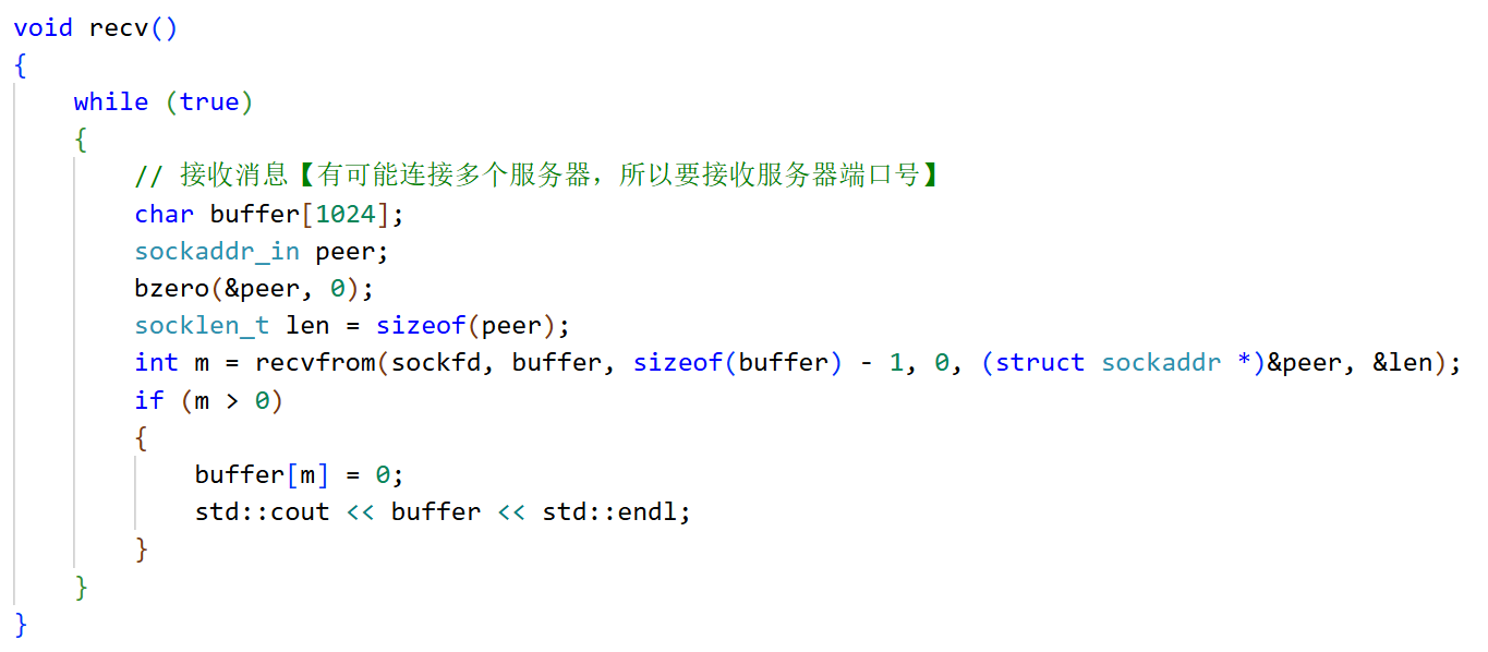 {while (true){// 接收消息【有可能连接多个服务器,所以要接收服务器端口号】char buffer[1024];sockaddr_in peer;bzero(&peer, 0);socklen_t len = sizeof(peer);int m = recvfrom(sockfd, buffer, sizeof(buffer) - 1, 0, (struct sockaddr *)&peer, &len);if (m > 0){buffer[m] = 0;std::cout << buffer << std::endl;}}