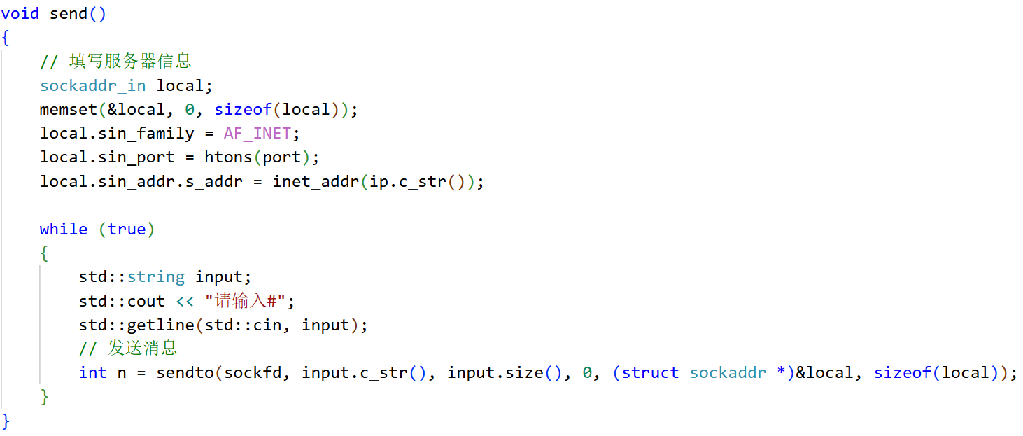 {// 填写服务器信息sockaddr_in local;memset(&local, 0, sizeof(local));local.sin_family = AF_INET;local.sin_port = htons(port);local.sin_addr.s_addr = inet_addr(ip.c_str());while (true){std::string input;std::cout << "请输入#";std::getline(std::cin, input);// 发送消息int n = sendto(sockfd, input.c_str(), input.size(), 0, (struct sockaddr *)&local, sizeof(local));}