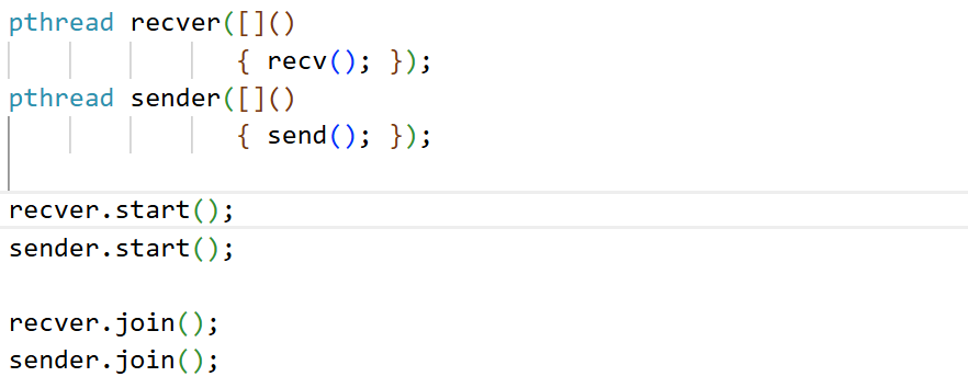 {if (argc != 3){std::cout << "Usage: ./server IP port" << std::endl;return 1;}// using_screen_strategy();ip = argv[1];port = std::stoi(argv[2]);// 创建套接字sockfd = socket(AF_INET, SOCK_DGRAM, 0);if (sockfd < 0){LOG(log_level::Fatal) << "socket 创建失败!";exit(1);}LOG(log_level::Info) << "socket 创建成功!" << sockfd;pthread recver([](){ recv(); });pthread sender([](){ send(); });recver.start();sender.start();recver.join();sender.join();return 0;