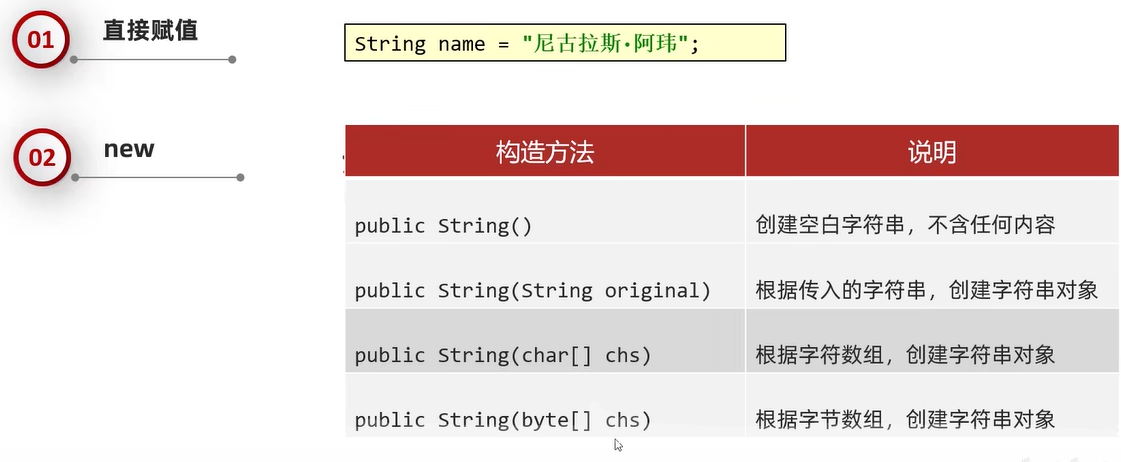 package com.jdL.day10classwork;public class Stringtest01 {public static void main(String[] args) {//使用new方式获取一个对象//使用空参构造String str=new String();System.out.println(str);//使用有参构造String str1=new String("abc");System.out.println(str1);//传递一个字符数组,根据字符数组再创建一个新的字符串对象char[] c={'a','b','c','d','e'};String str2=new String(c);System.out.println(str2);//传递一个字节数组,根据字节数组再创建一个新的字符串对象byte[] a={97,98,99,100};String str3=new String(a);System.out.println(str3);}