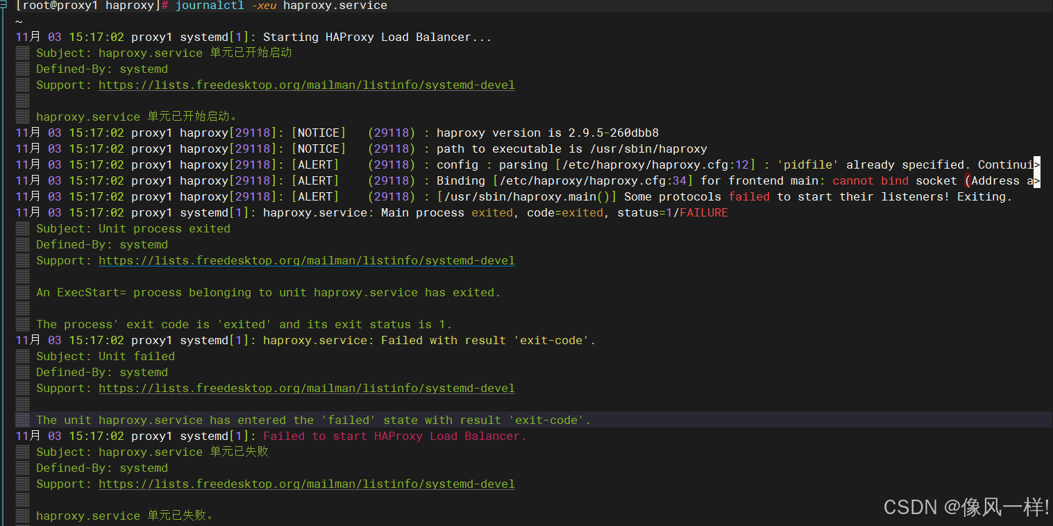 通过查看日志和端口状态信息,发现80端口被nginx占用,导致haproxy服务启动失败。
