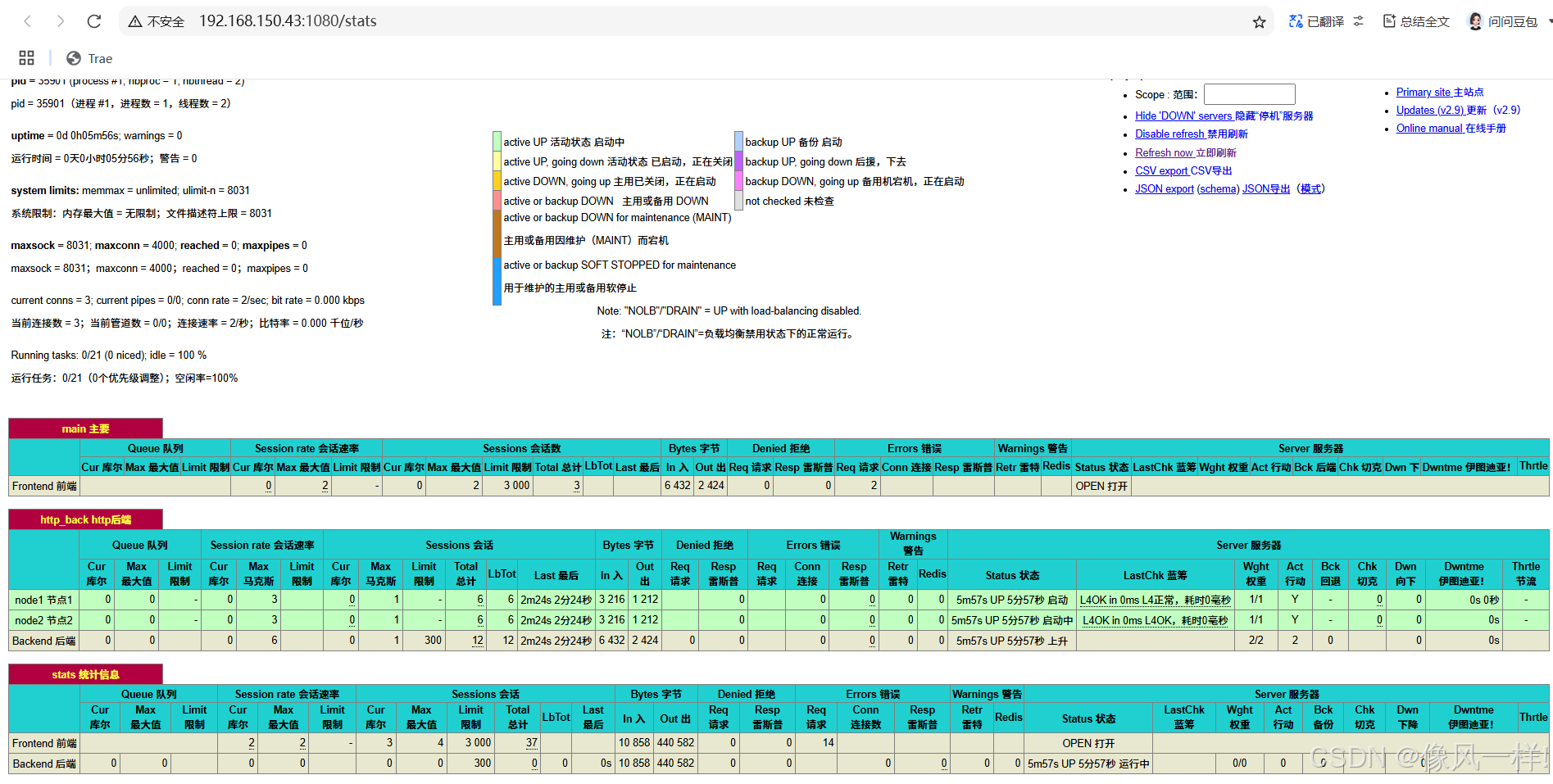 listen stats #定义监控页面 mode httpoption httplogbind *:1080 #绑定端口1080 stats refresh 30s #每30秒更新监控数据 stats uri /stats #访问监控页面的uri stats realm HAProxy\ Stats #监控页面的认证提示 stats auth admin:admin #监控页面的用户名和密码