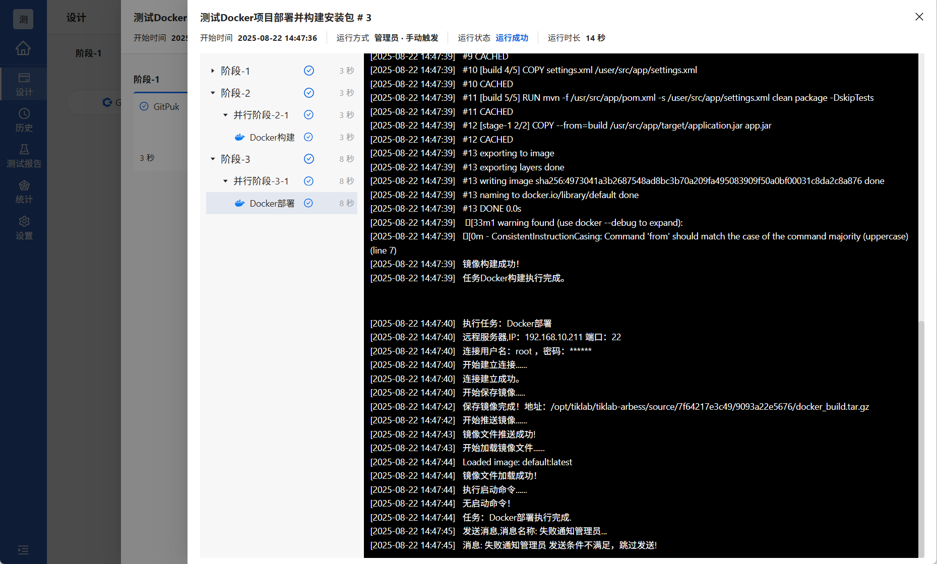 至此,用户可通过流水线实现Docker部署以及构建安装包。