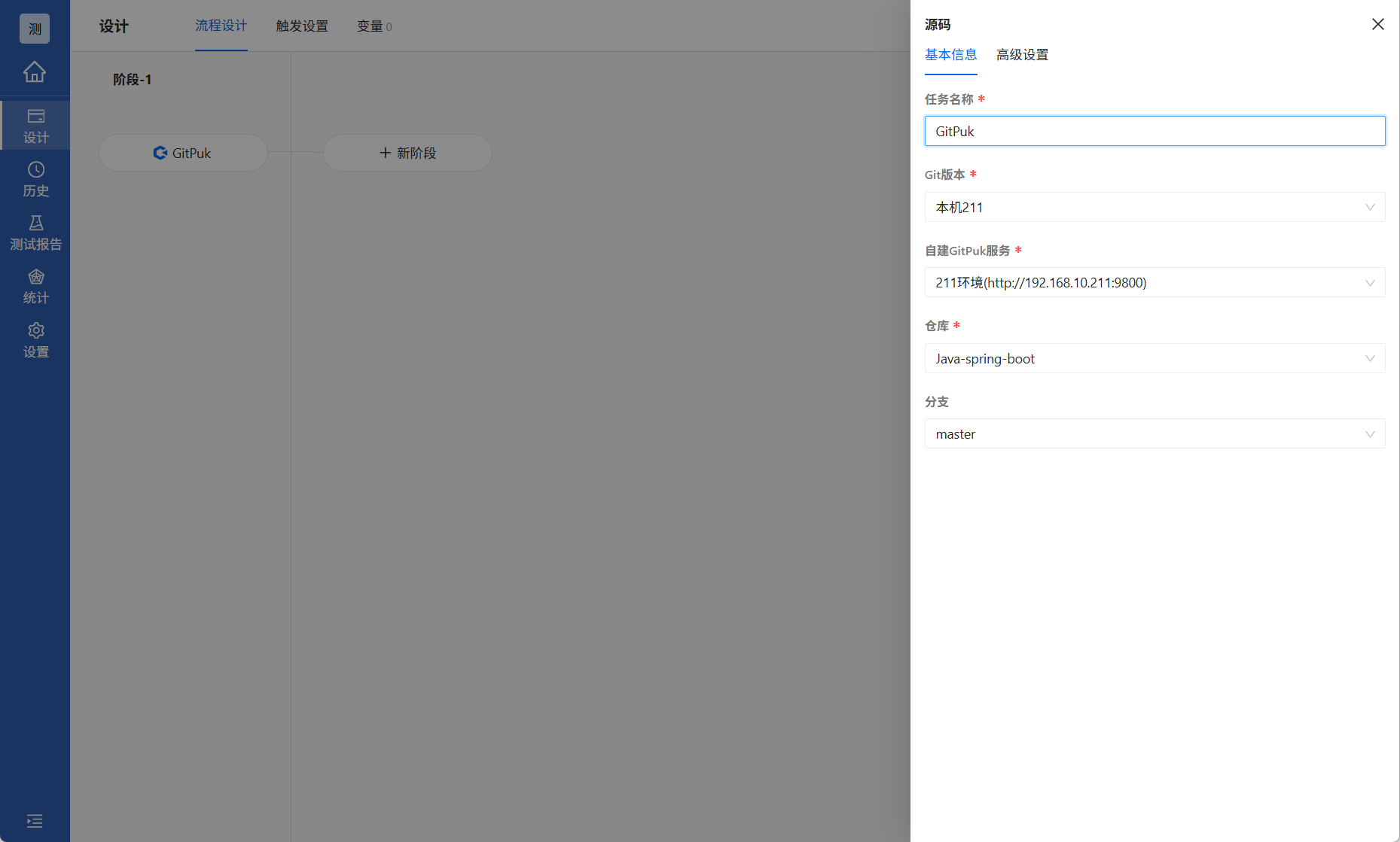 服务集成完毕之后,进入流水线设计,点击新阶段→源码→自建GitPuk。