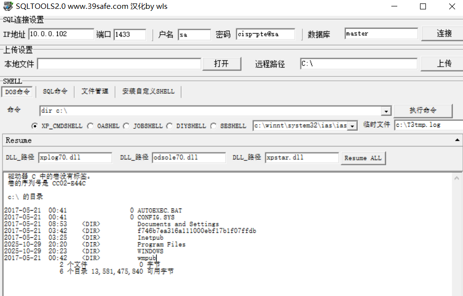 这里发现sa用户,我们直接用sqlserver提权工具,在c盘根目录下没有发现key
