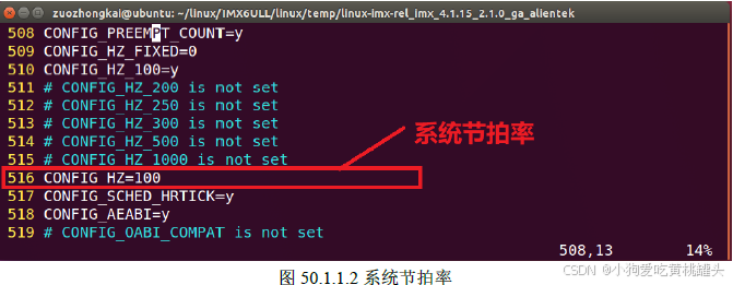 从图 50.1.1.1可以看出,可选的系统节拍率为 100Hz、 200Hz、 250Hz、 300Hz、 500Hz和1000Hz,默认情况下选择 100Hz。设置好以后打开 Linux内核源码根目录下的 .config文件,在此文件中有如图 50.1.1.2所示定义: