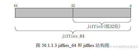 jiffies_64和 jiffies其实是同一个东西, jiffies_64用于 64位系统,而 jiffies用于 32位系统。为了兼容不同的硬件, jiffies其实就是 jiffies_64的低 32位, jiffies_64和 jiffies的结构如图50.1.1.3所示: