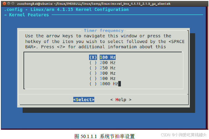 Linux内核中有大量的函数需要时间管理,比如周期性的调度程序、延时程序、对于我们驱动编写者来说最常用的定时器。硬件定时器提供时钟源,时钟源的频率可以设置, 设置好以后就周期性的产生定时中断,系统使用定时中断来计时。中断周期性产生的频率就是系统频率,也叫做节拍率 (tick rate)(有的资料也叫系统频率 ),比如 1000Hz 100Hz等等说的就是系统节拍率。系统节拍率是可以设置的,单位是 Hz,我们在编译 Linux内核的时候可以通过图形化界面设置系统节拍率,按照如下路径打开配置界面:
