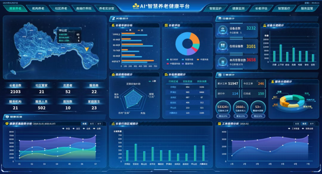 在软件系统搭建上,作为科技研发的AI⁺智慧养老健康平台(aiAging),以人工智能技术为核心驱动力,整合深度学习、物联网、大数据等先进技术,构建“监测-预警-干预-服务”闭环管理体系,实现智能硬件操作数据秒级同步,通过AI赋能,为老年人打造更优质的养老服务体验。