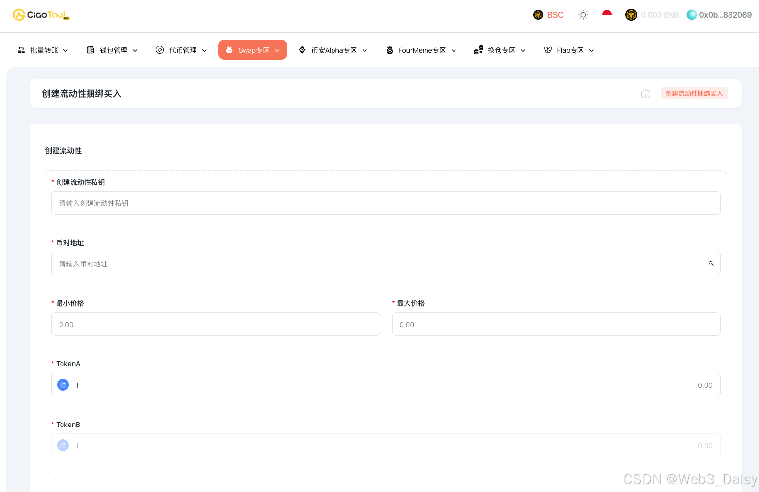 打开 CiaoTool Swap V3 创建流动性捆绑买入页面