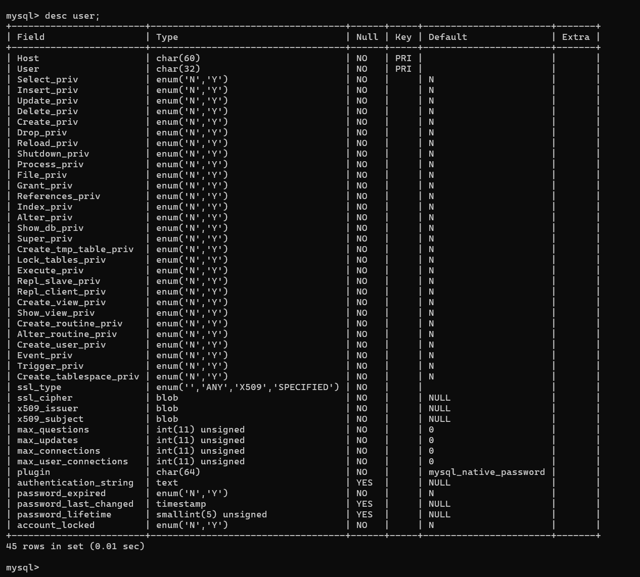 ..._priv | 用户权限(如Select_priv表示查询权限,Create_priv表示创建权限) |