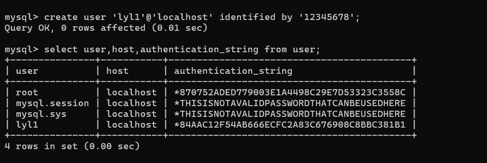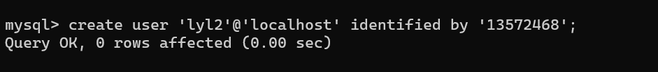查询结果中新增一行:| lyl1 | localhost | *84AAC12F54AB666ECFC2A83C676908C8BBC381B1 |,表示用户创建成功,可使用用户名或密码在本机登录。
