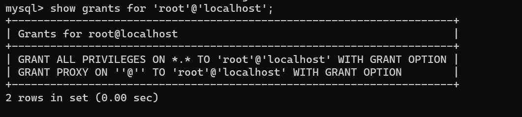 show grants for '用户名'@'登录的主机/IP';查看root权限(root拥有所有权限):