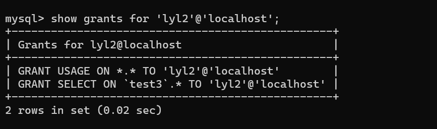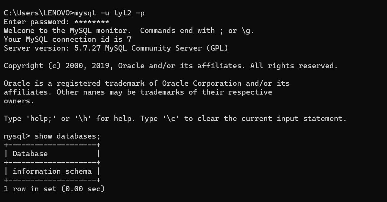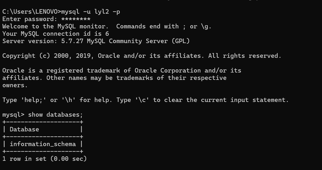 (2)Win+R进入cmd打开新终端,通过mysql -u lyl2 -p登录lyl2用户,然后查看未授权前lyl2的权限: