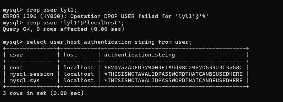 drop user lyl1;正确操作:明确指定host(与创建时的host一致)