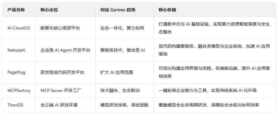行云创新深耕云原生与AI领域十余年,打造以AI-CloudOS为核心底层,NebulaAI、PagePlug、MCPFactory、TitanIDE为协同引擎的全栈产品矩阵,精准匹配Gartner技术趋势,打通 “算力调度 - 数据就绪 - 模型研发 - AI应用 - 治理运营” 全链路,助力企业将技术趋势转化为实际业务增长,成为数智转型的核心支撑引擎。