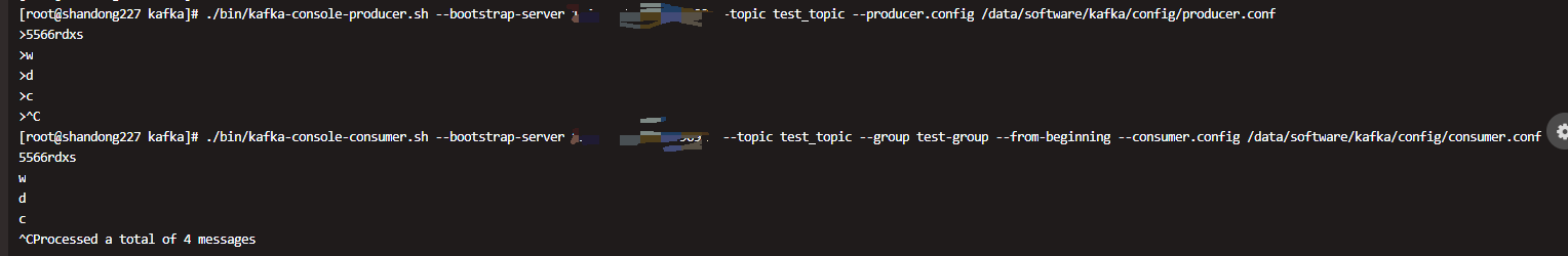 ./bin/kafka-console-consumer.sh --bootstrap-server yourIP:9092 --topic test_topic --group test-group --from-beginning --consumer.config /data/software/kafka/config/consumer.conf