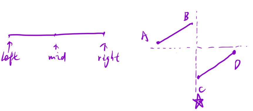 例如这道题 left和right的中间点mid 落到的是AB和CD里面 这样找就容易找到二分算法的条件