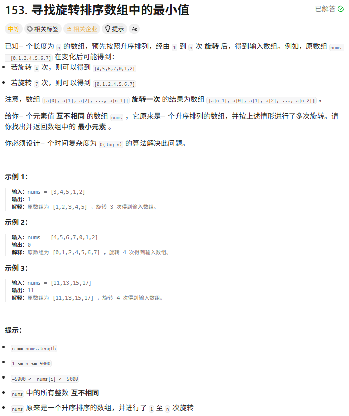{//选择A点为参照物public int findMin(int[] nums) {  int left = 0 ,right = nums.length-1;int x = nums[left] ;//记录下A点的元素//特殊情况的处理if(nums[left]<nums[right]){return nums[left];}while(left<right){int mid = left+(right-left)/2;if(nums[mid]>=x) left=mid+1; //right = mid ;else right = mid ;//left = mid + 1;}return nums[left];}