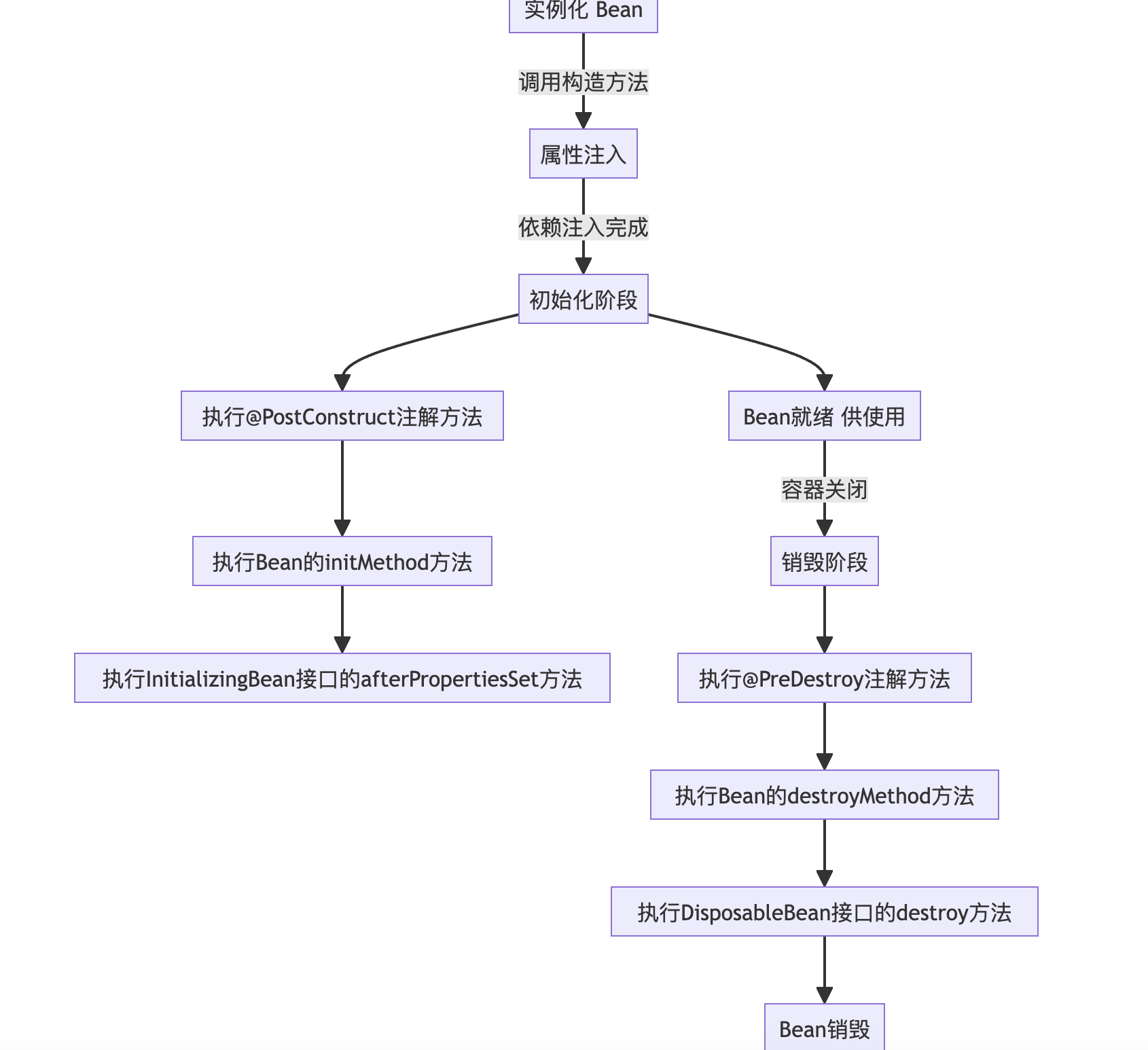 在学习注解前,我们需先明确Bean的完整生命周期。Spring Boot中Bean从创建到销毁大致分为4个阶段:实例化、属性注入、初始化、销毁。生命周期注解主要作用于初始化阶段和销毁阶段。为了更直观理解,先看一张流程图: