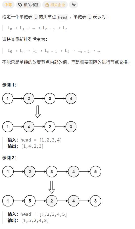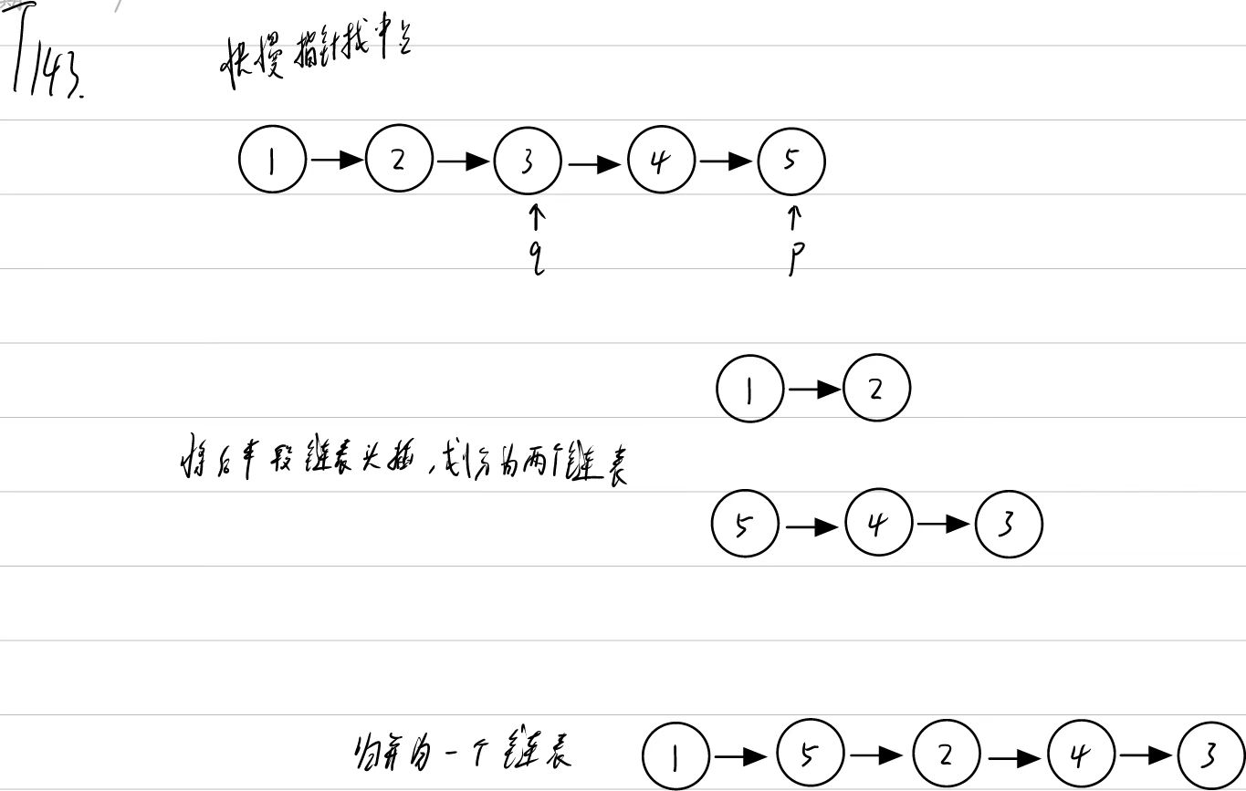 class Solution { public void reorderList(ListNode head) {ListNode p = head;                      //快指针ListNode q = head;                      //慢指针while(p.next != null){p = p.next.next;                    //走两格q = q.next;                         //走一格if(p == null)                       //偶数走到终点break;}//令p指向后半段链表的开端p = q.next;q.next = null;//反转后半段链表q = new ListNode();ListNode r = p;while(p != null){p = p.next;r.next = q.next;q.next = r;r = p;}//归并p = head;r = head;int sum = 0;q = q.next;while(p != null){sum++;if(sum % 2 == 0 && q != null){r.next = q;q = q.next;r = r.next;r.next = p;}else{r = p;p = p.next;}}r.next = q;}