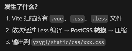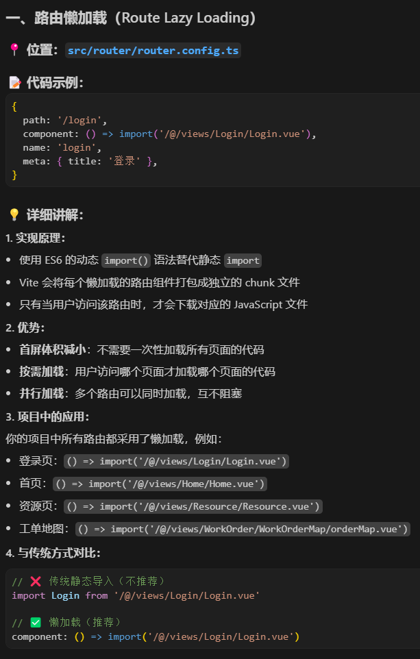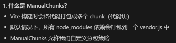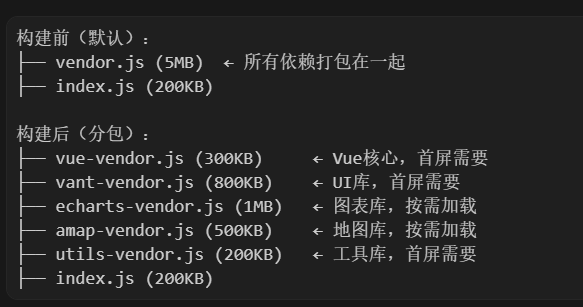 const vendorLibs: { match: string[]; output: string }[] = [// Vue 核心库(必须优先加载){match: ['vue', 'vue-router', 'pinia'],output: 'vue-vendor'},// UI 组件库(体积较大){match: ['vant'],output: 'vant-vendor'},// 地图相关(按需加载){match: ['@amap'],output: 'amap-vendor'},// 工具库{match: ['axios', 'dayjs', 'lodash'],output: 'utils-vendor'},// 图表库(体积大,且不是首屏必需){match: ['echarts'],output: 'echarts-vendor'}