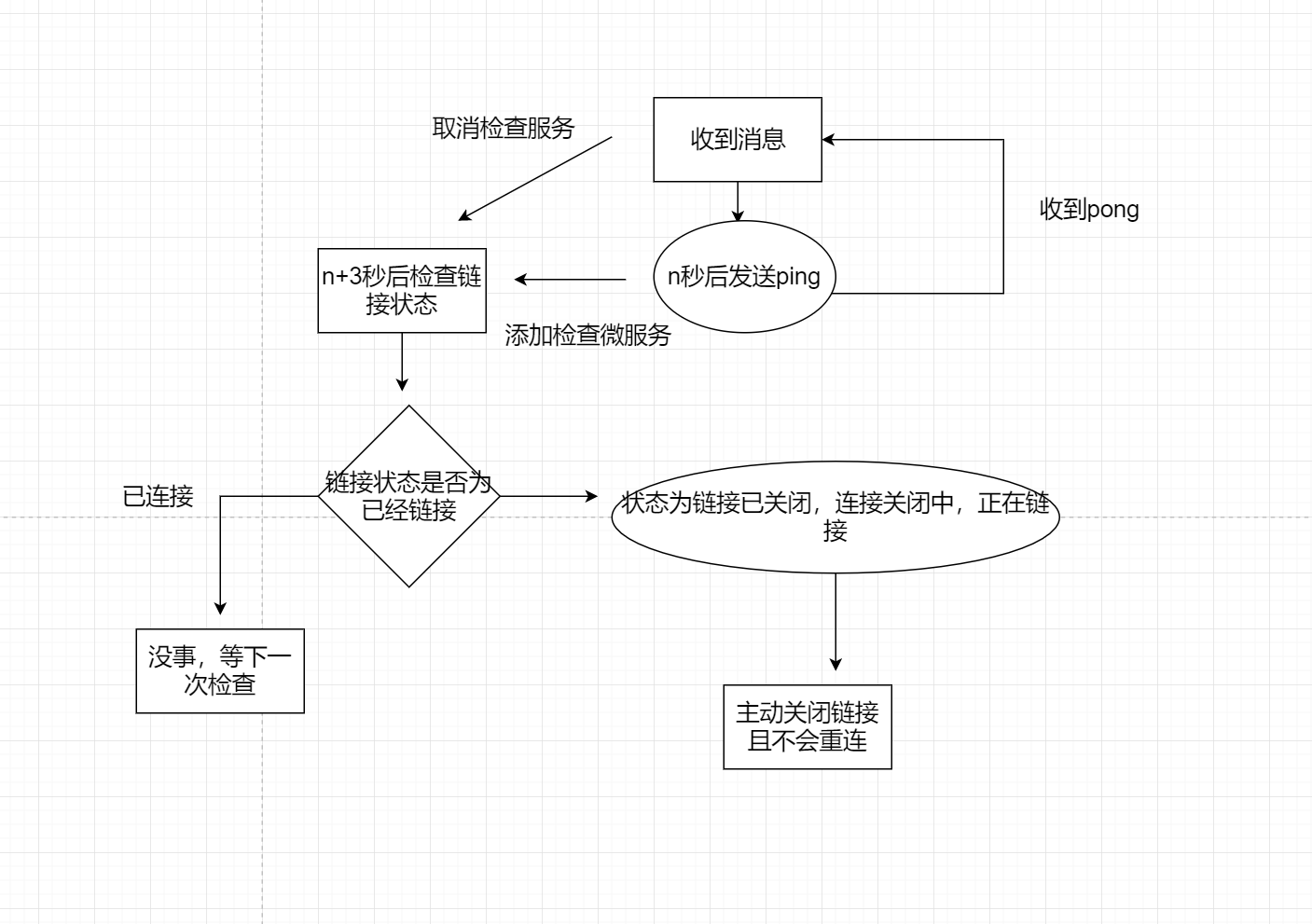 当链接建立或收到消息后,3秒后发ping,6秒后检查连接状态。如果在3-6秒之间又收到消息(pong或ws消息),就会取消检查连接状态,并开始重复上面操作。如果在3秒内收到,就会取消ping发送和连接状态。如果没有收到,就会主动检查ws.readyState(实时的,但有延迟)。如果没有异常,则继续执行心跳。
