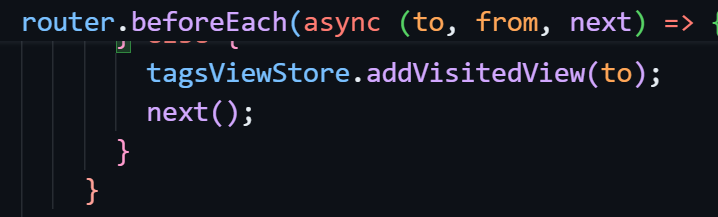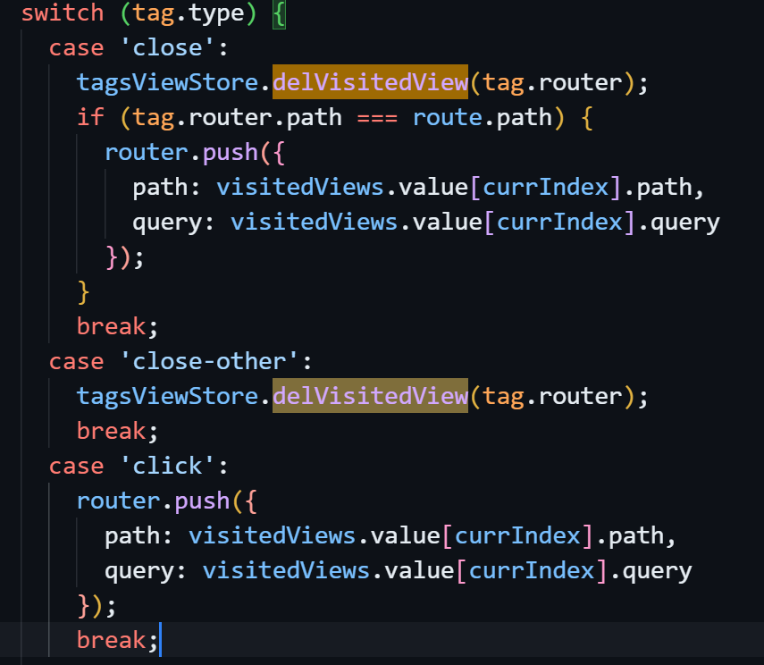 function addVisitedView(view: TagView) {// 没有标题无法正常显示if (!view.meta || !view.meta.title) return;// 已经有重复路由了if (visitedViews.value.some(v => v.path === view.path)) {replaceVisitedViewQuery(view);return;}visitedViews.value.push(view)