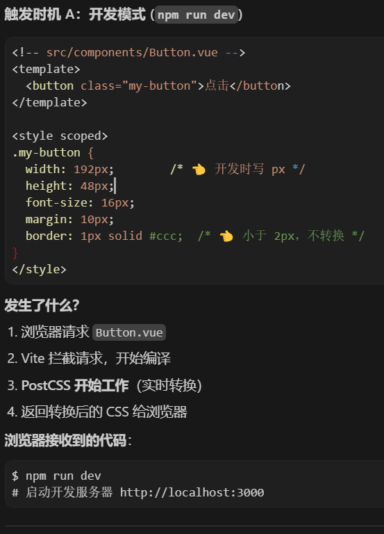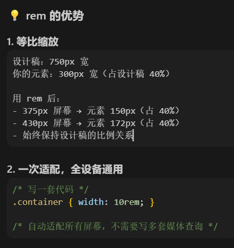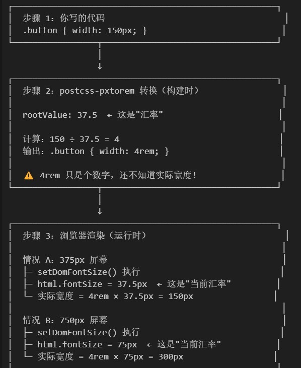 通过 postcss-pxtorem(构建时自动转 px 到 rem) + setRootFontSize(运行时动态设置基准值) 两部分配合