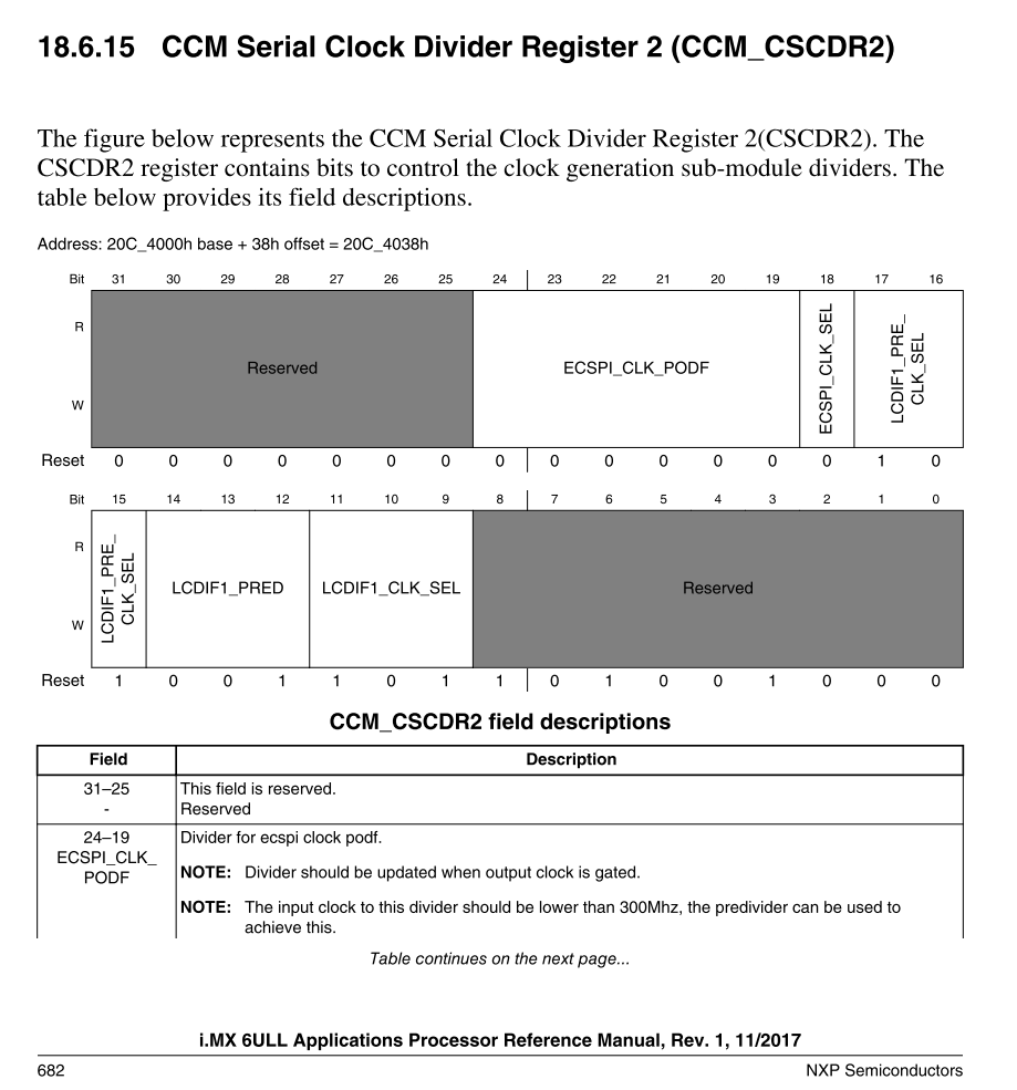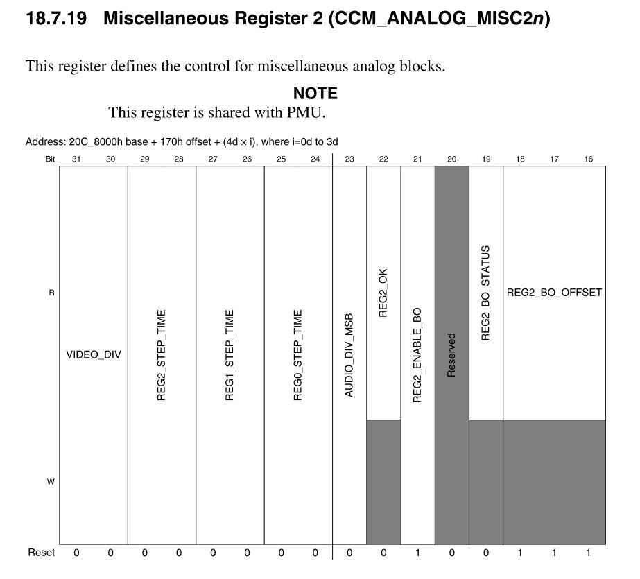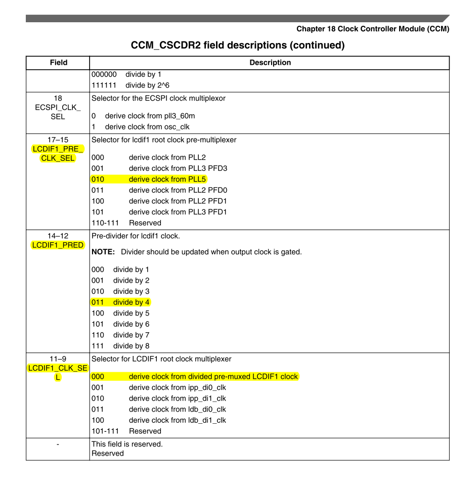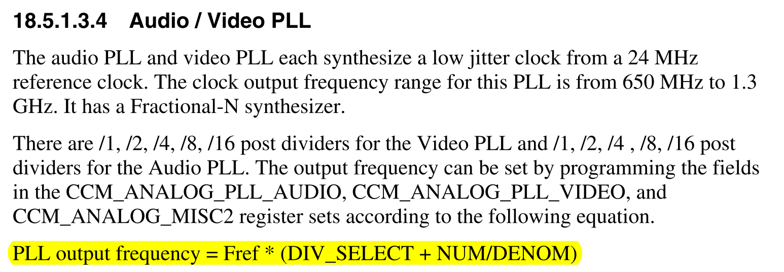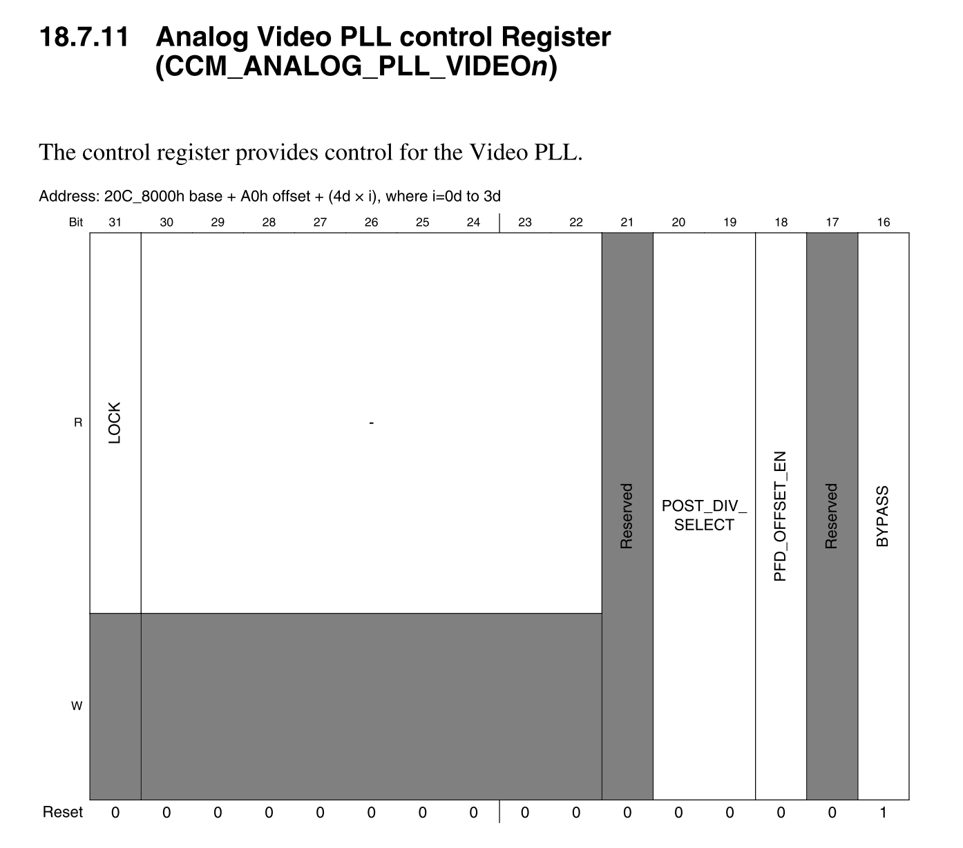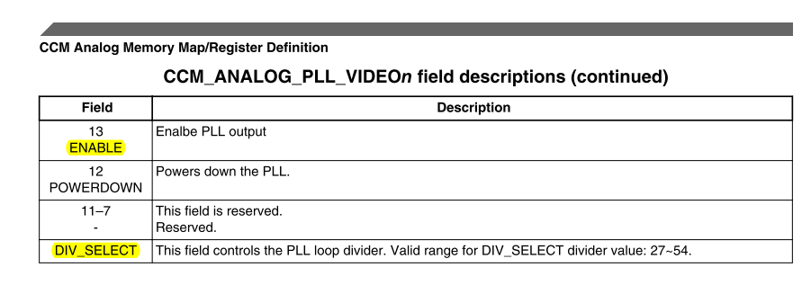 {CCM_ANALOG->PLL_VIDEO |= (1 << 16);CCM_ANALOG->PLL_VIDEO |= (1 << 12);CCM_ANALOG->PLL_VIDEO_NUM = 0;CCM_ANALOG->PLL_VIDEO_DENOM = 1;CCM_ANALOG->PLL_VIDEO &= ~(0x7F << 0);CCM_ANALOG->PLL_VIDEO |= (42 << 0);CCM_ANALOG->PLL_VIDEO &= ~(3 << 19);CCM_ANALOG->PLL_VIDEO |= (2 << 19);CCM_ANALOG->PLL_VIDEO &= ~(1 << 12);CCM_ANALOG->PLL_VIDEO |= (1 << 13);while((CCM_ANALOG->PLL_VIDEO & (1 << 31)) == 0);CCM_ANALOG->PLL_VIDEO &= ~(1 << 16);unsigned int t;t = CCM->CSCDR2;t &= ~(7 << 15);t |= (2 << 15);t &= ~(7 << 12);t |= (3 << 12);t &= ~(7 << 9);CCM->CSCDR2 = t;CCM->CBCMR |= (7 << 23);