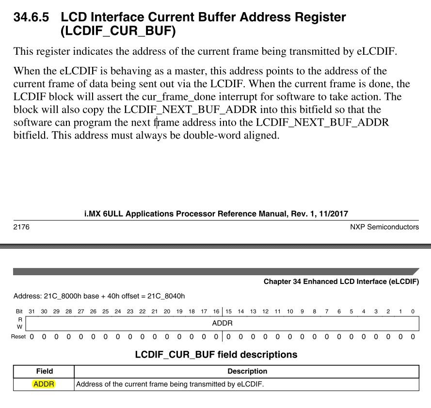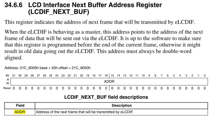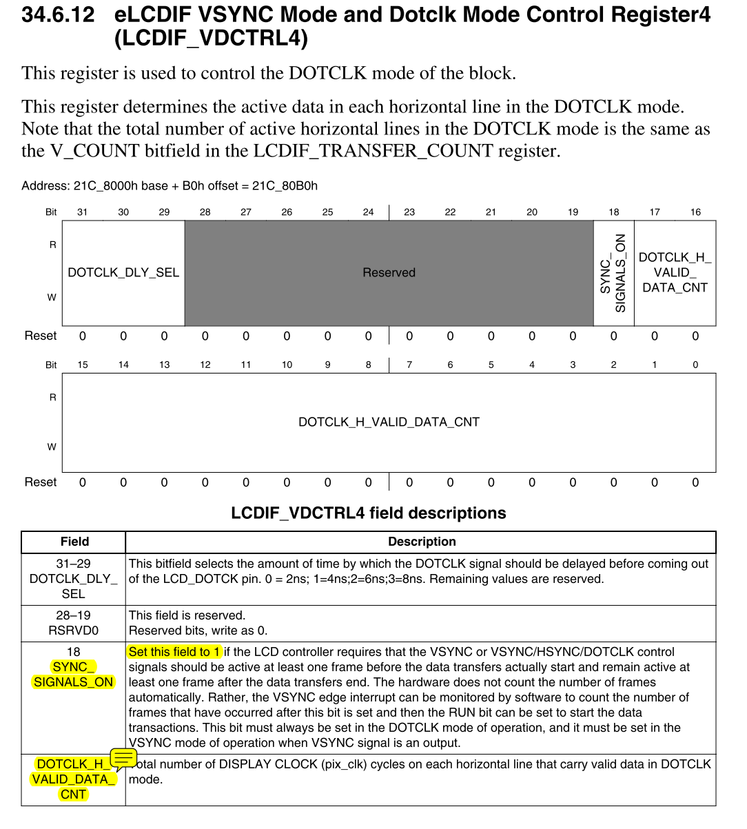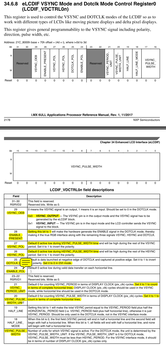 {init_lcd_io();reset_lcd();    printf("before Init lcd \n");init_lcd_clk();printf("after Init lcd \n");lcd_dev.width = 800;lcd_dev.height = 480;lcd_dev.hspw = 48;lcd_dev.hbp = 88;lcd_dev.hfp = 40;lcd_dev.vspw = 3;lcd_dev.vbp = 32;lcd_dev.vfp = 13;lcd_dev.pix_size = 4;lcd_dev.frame_buffer = LCD_FRAMEBUFFER_ADDR;lcd_dev.fore_color = 0x0000FF00;lcd_dev.back_color = 0x00000000;LCDIF->CTRL |= (1 << 19) | (1 << 17) | (3 << 10) | (3 << 8) | (1 << 5);LCDIF->CTRL1 = (7 << 16);LCDIF->TRANSFER_COUNT = (lcd_dev.height << 16) | (lcd_dev.width);LCDIF->CUR_BUF = lcd_dev.frame_buffer;LCDIF->NEXT_BUF = lcd_dev.frame_buffer;LCDIF->VDCTRL0 = (1 << 28) | (1 << 24) | (1 << 21) | (1 << 20) | (lcd_dev.vspw << 0);LCDIF->VDCTRL1 = lcd_dev.height + lcd_dev.vspw + lcd_dev.vfp + lcd_dev.vbp;LCDIF->VDCTRL2 = (lcd_dev.hspw << 18) | (lcd_dev.hspw + lcd_dev.hfp + lcd_dev.hbp + lcd_dev.width);LCDIF->VDCTRL3 = ((lcd_dev.hspw + lcd_dev.hbp) << 16) | (lcd_dev.vspw + lcd_dev.vbp);LCDIF->VDCTRL4 = (1 << 18) | (lcd_dev.width);LCDIF->CTRL |= (1 << 0);delayms(20);