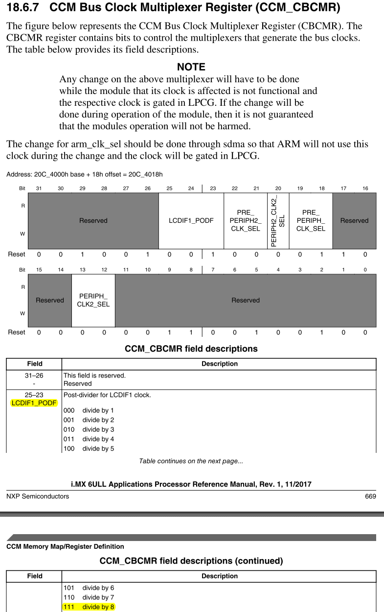 这里的31MHz其实指的就是IMX这片Soc的LCD控制器的工作频率。我们必须按照这个数值来配置好LCD控制器的时钟。I.MX6UL的LCD控制器全称为Enhanced LCD Interface (eLCDIF)(增强型LED接口),在手册第34章第2131页。如果需要配置eLCDIF的工作频率为51.2MHz的话,可以参考时钟树: