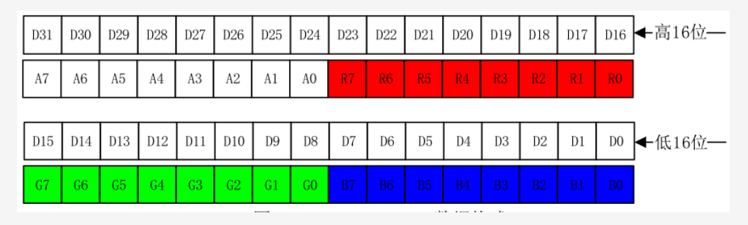上图中,一个像素点是 4 个字节,其中 bit31~bit24 是 Alpha 通道,bit23~bit16 是RED 通