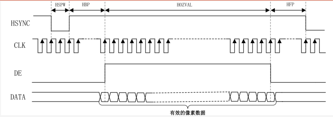 显示完一行数据以后需要等待 HFP 个 CLK 时间才能发出下一个 HSYNC 信号,所以显示一行所需要的时间就是:HSPW + HBP + HOZVAL + HFP。