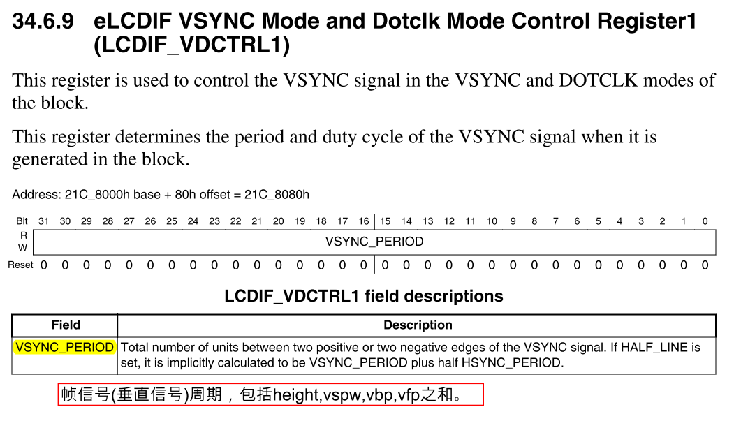 ① VSYNC:帧同步信号,当此信号有效的话就表示开始显示新的一帧数据,查阅所使用的LCD 数据手册可以知道此信号是低电平有效还是高电平有效,假设此时是低电平有效;