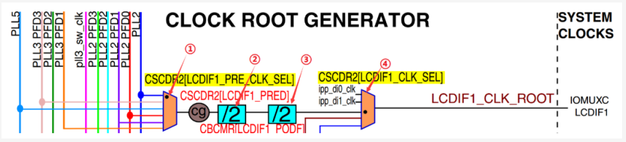 图示1的位置是一个选择器,相当于是选择eLCDIF的时钟源。时钟源有6种选择:PLL2 、PLL3_PFD3、PLL5、PLL2_PFD0 、PLL2_PFD1和 PLL3_PFD1。PLL5又名VIDEO PLL,很明显就是专门给视频外设作为时钟源的,自然是选择PLL5了。之前我们并没有配置过PLL5,因此肯定是需要配置一下。此后的2、3位置是两个分频器,再经由一个选择器最终到达eLCDIF外设,eLCDIF外设的实际时钟名为LCDIF1_CLK_ROOT。