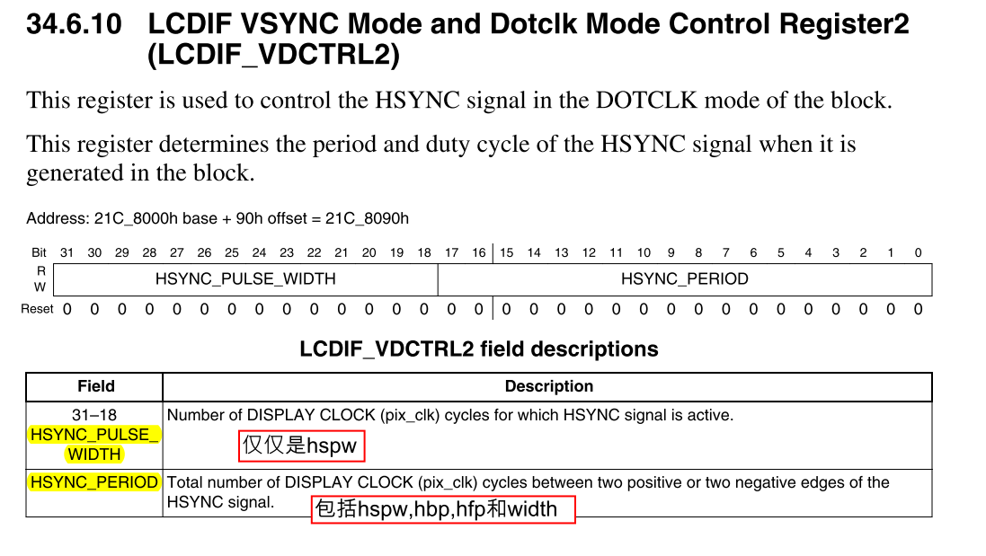 ② HSPW:有些地方也叫做 thp,是 HSYNC 信号宽度,也就是 HSYNC 信号持续时间。HSYNC信号不是一个脉冲,而是需要持续一段时间才是有效的,单位为 CLK;
