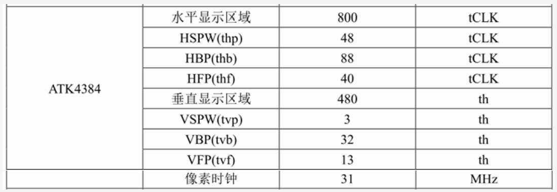 我们使用的alpha开发板搭载了一块由正点原子生产的RGB LCD,型号为ATK4384,分辨率为800*480。其时间参数如下: