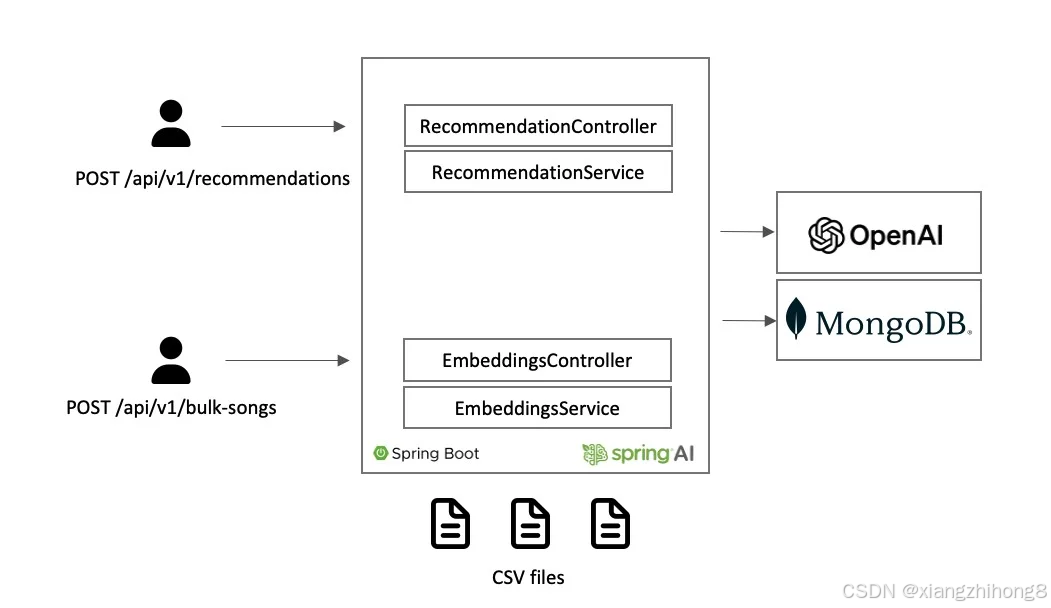 在 SongEmbeddingService 类中,有一个名为 createEmbeddingFromSongList() 的方法,首先读取 CSV 文件,每一行被转换为歌曲列表,作为文档保存在 MongoDB 中。然后调用 embedDocuments() 方法,该方法触发对 OpenAI 的调用以向量化内容并保存在 Vector Store 中。所有这些通过 Spring AI 公开的接口操作,对用户来说是透明的。