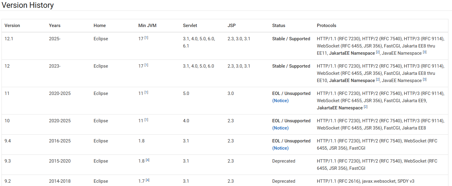 jetty-ee8: 支持 Java EE 8 (javax.servletAPI)jetty-ee9: 支持 Jakarta EE 9 (jakarta.servletAPI, Servlet 5.0)jetty-ee10: 支持 Jakarta EE 10 (jakarta.servletAPI, Servlet 6.0)jetty-ee11: 支持 Jakarta EE 11 (jakarta.servletAPI, Servlet 6.1)
