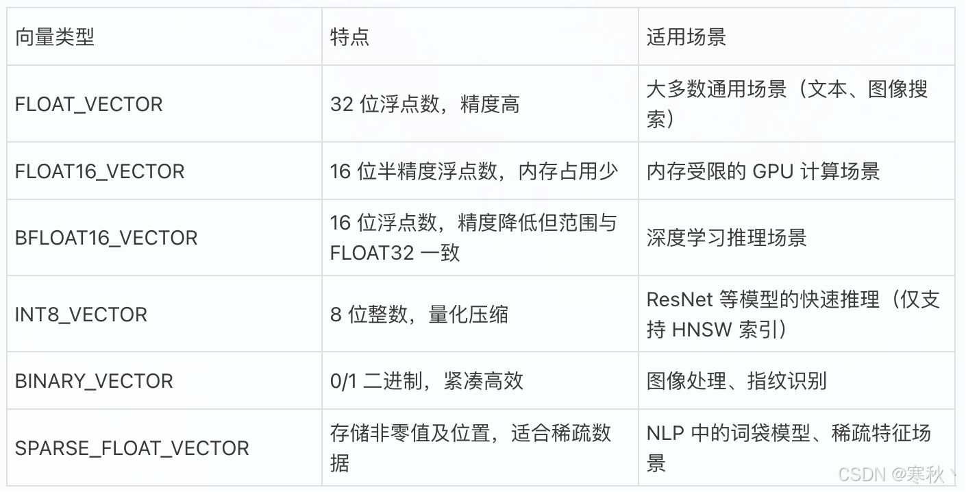 schema.add_field(field_name="content_vector",  # 字段名:内容向量datatype=DataType.FLOAT_VECTOR,  # 类型:32位浮点数向量dim=768  # 向量维度(必填):如BERT模型生成的向量通常为768维