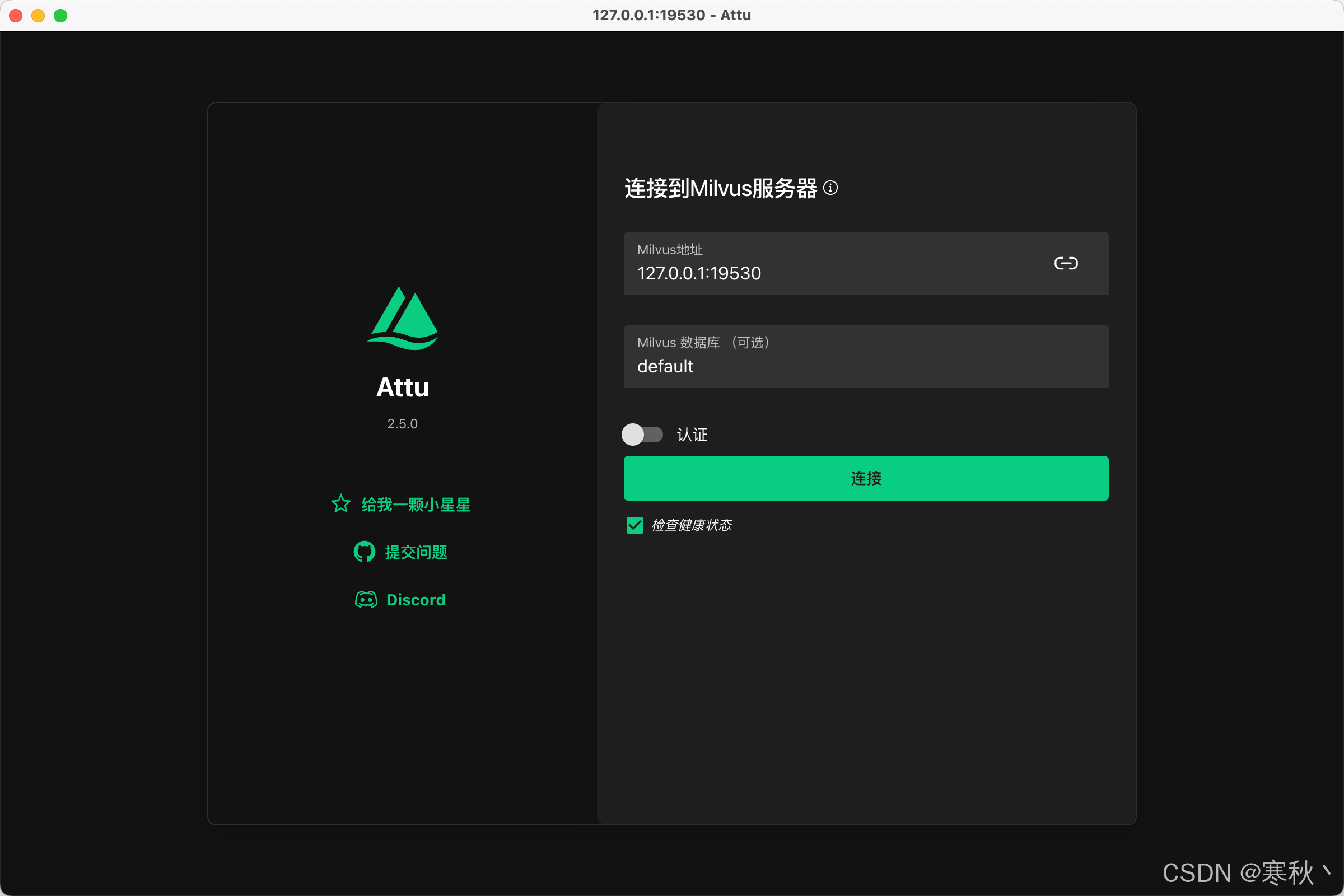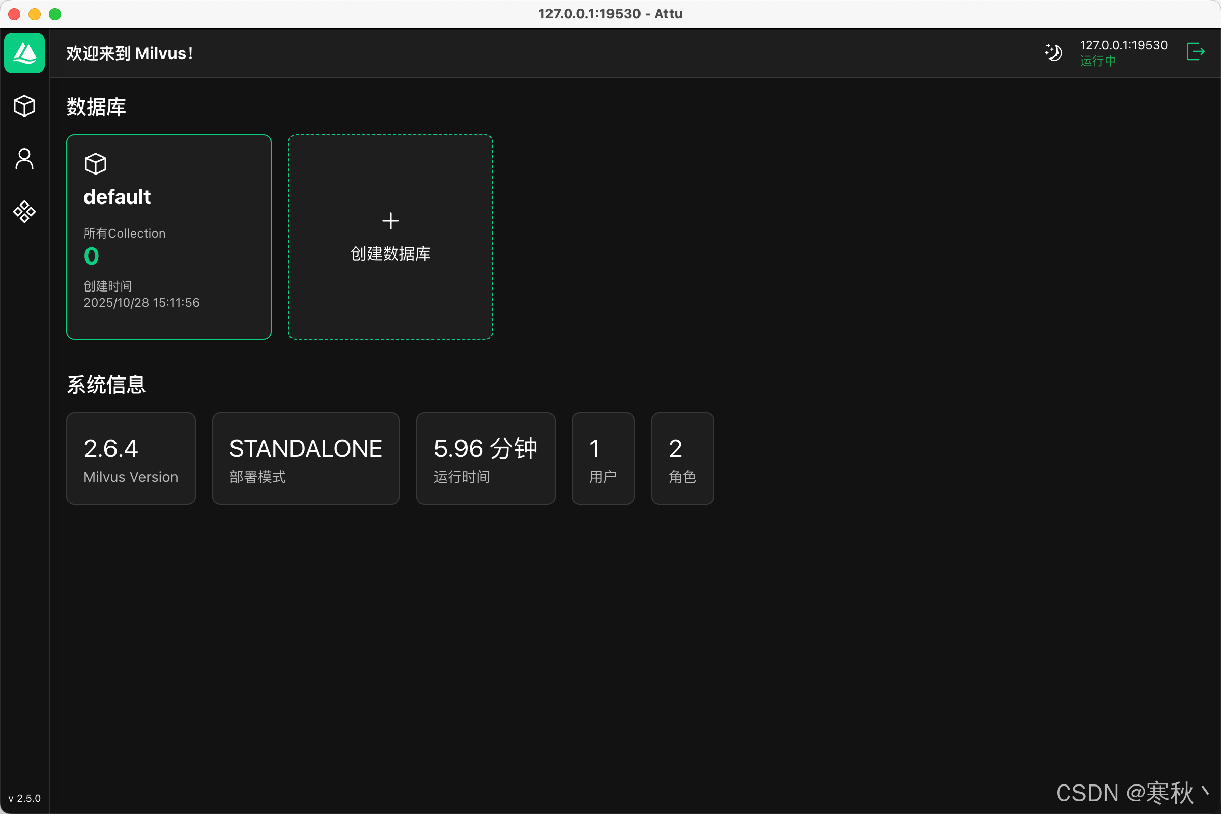 安装完成后启动Attu,其中Milvus地址填写127.0.0.1:19530,数据库输入default。