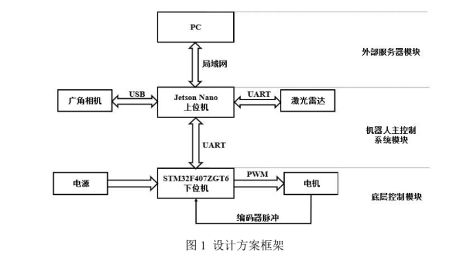 (2)机器人主控制模块:采用主从控制作为智能采购机器人控制系统方式, 上位机承担高层次的策略制定与协同调节任务,下位机分布式控制主要实现多机 器人系统间协同作业的控制,通过分布式控制能够提高多机器人工作时的效率。 选择上位机Jetson nano 作为主控制器,用来处理机器人控制过程中的数据和运动,将处理后的数据信息发送给下位机。传感器部分由激光雷达和广角相机组成, 其中激光雷达与上位机通过UART连接,广角相机与上位机通过USB连接。