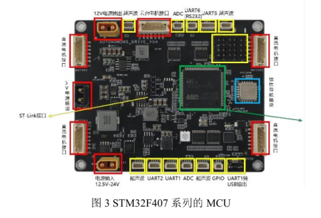 STM32F407 系列的MCU的板载预留了许多的接口资源,还包含了一些常用外设,其中UART1转USB接口与上位机Jetson nano通过一路 USB串口通信。 还有4个直流电机接口分别与4个无刷电机相连接,控制电机的速度。电池通过 电源输入接口给STM32F40供电,再由电源输出接口给上位机供电。
