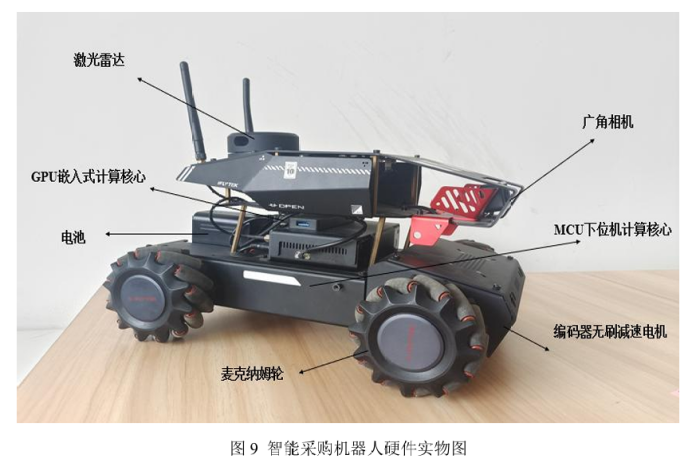 机器人整体结构展示 本设计搭建的智能采购机器人硬件实物图如图9所示,其硬件整体结构分为 3 层,其中最底层带有4个编码器无刷减速电机组成线性底盘,电机上装有麦克纳姆轮,上一层包括GPU嵌入式计算核心、MCU下位机计算核心、电池,最上层装有激光雷达和广角相机。