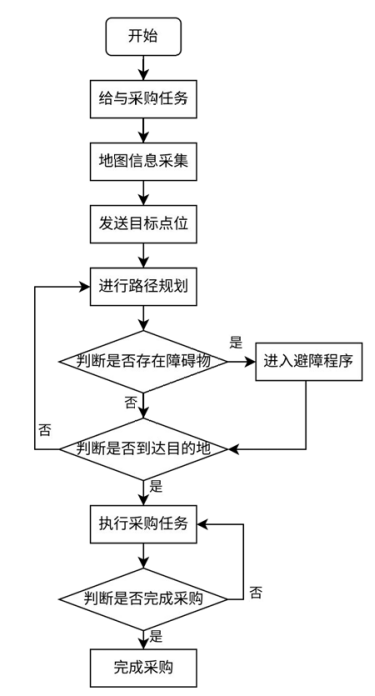 该系统由多个模块组成,设计由上位机与PC端进行远程连接完成人机互动, 用户在PC端给予智能采购机器人本次执行的采购任务和采购的目标地点,采购机器人可以自主规划路径前往目标地点,并且通过广角相机完成识别过程,从而完成采购任务,由于考虑到路面的复杂情况,还增加了采购机器人的智能避障功能和路标识别功能,在雷达采集到障碍物后,会重新规划路径完成避障功能;在摄像头识别到目标后,会根据路标完成下一步指示。主程序设计流程图如图所示: